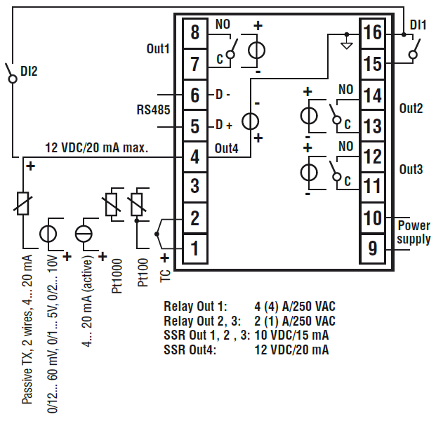 OUT1: Реле SPST-NO 4A, 240 В~ или транзисторный выход для управления твердотельными реле до 13 В= макс. 1mA, 10.5 В min 15 мА ± 10%;