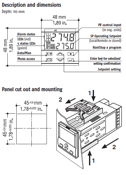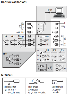 Поддерживаемые типы сигналов датчиков: J, K, L, S, T, Pt100, 0/10...50 мВ, 0/4...20 мА, IR probes (J и K тип), пользовательская характеристика. Точность входа 0,25% или +/-1 знак для температурных датчиков и 0,1 % или +/-1 знак для нормализованных сигналов.
