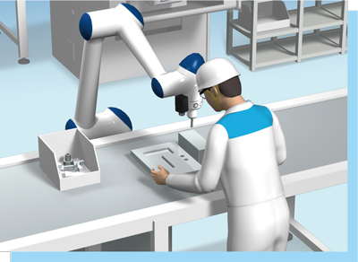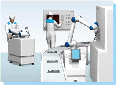 Постановление о промышленной безопасности и охране здоровья (Ordinance on Industrial Safety and Health) было пересмотрено в 2013 году, и позволило устанавливать специальных роботов без защитных ограждений. Теперь мы можем обеспечить безопасность людей благодаря развитию робототехники, встраивая датчик безопасности в корпус робота, что помогает разрабатывать совместных (коллобративных) роботов, которые могут работать с людьми в ограниченном пространстве. Но не только безопасность определяет коботов, важно упрощение процесса программирования и наладки. Например, вы можете легко обучать роботов движениям с помощью пульта для программирования, который работает интуитивно, как планшет, или просто удерживая и перемещая роботов вручную.