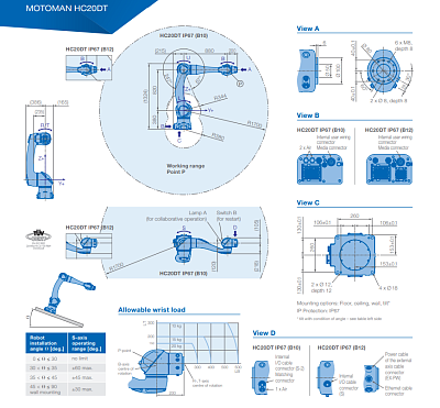 MOTOMAN HC20DT - это 6-осевой коллаборативный робот-манипулятор с большой полезной нагрузкой в 20 кг. Безопасность людей работающих рядом, обеспечивается технологией ограничения мощности и усилия, которая останавливает робота в случае контакта. Рука робота  спроектирована таким образом, чтобы избежать защемления руки или пальцев. Это позволяет коботу работать без дополнительных защитных ограждений, в зависимости от оценки риска, и экономит место и средства.