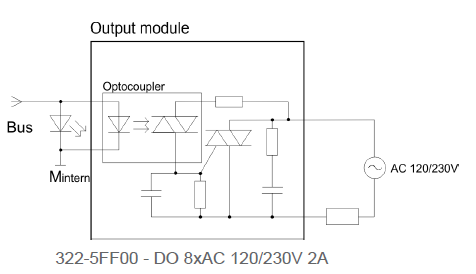 Модуль 322-5FF00 имеет 8 релейных выходов, рассчитанных на нагрузку до 2А на выход (120/230 В~). Выходы изолированы между собой и системной шиной. Состояние каждого выхода отображается на соответствующем светодиодном индикаторе.