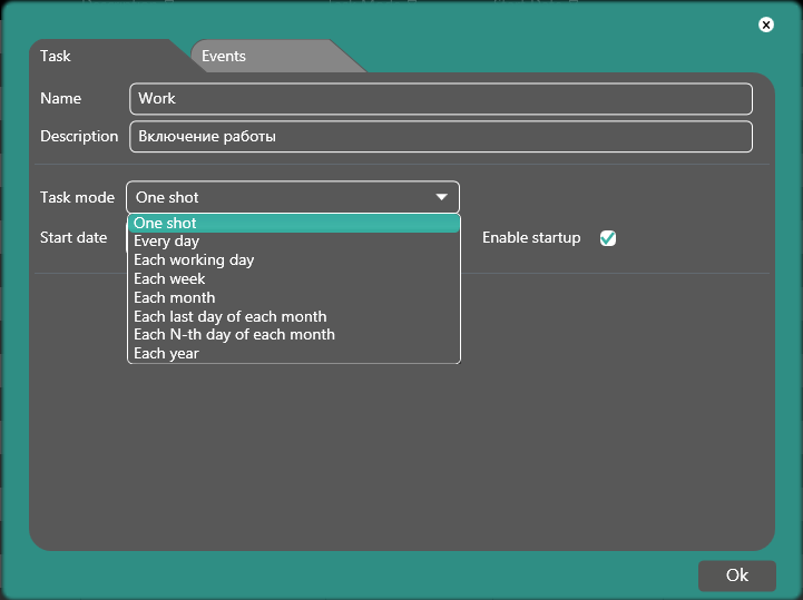 Основным объектом, с которым сталкивается проектировщик и пользователь при работе с расписаниями является действие (задача, Task). Они закладываются при проектировании системы и могут быть, как простыми (включить бит активирующий подпрограмму в контроллере), так и более сложной последовательностью (загрузить рецепт в контроллер, выключить бит ручного режима, включить бит подпрограммы, выдать текстовое сообщение на экран) или полноценной подпрограммой (скрипт, макрос, script, VB) или приложением. Действию так же предварительно задаются режим выполнения (разовый или периодический с различной базой периода) и дата и время исполнения. В дальнейшем, в зависимости от решения проектировщика, эти два параметра можно будет изменить через редактор Планировщика.